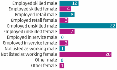 These statistics have been compiled from the 1851 census for Bell Yard. They show the age of its residents, where they came from, the size of their households, the comparison of male to female, and their employment status.